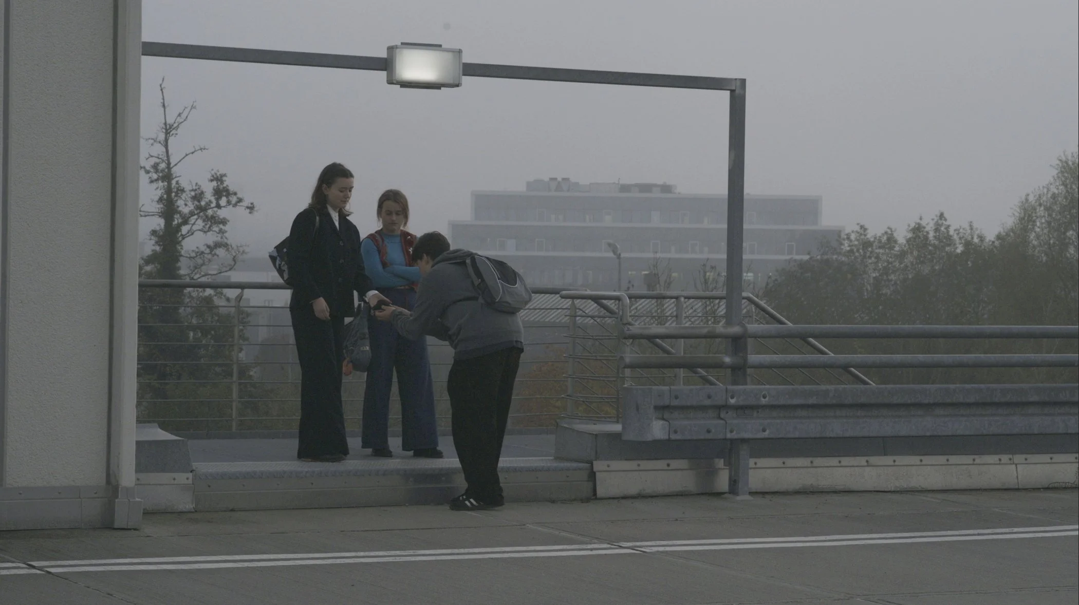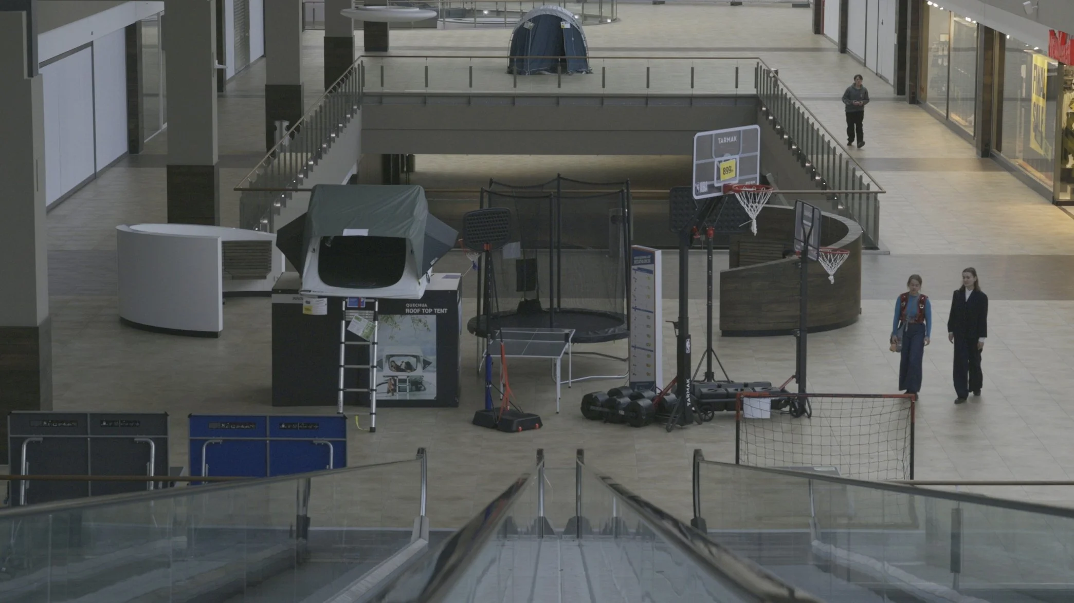 In einem entvölkerten Kaufhaus streift ein Junge einer Gruppe von Mädchen hinterher, er wiederum wird von einer anderen Gruppe beobachtet.